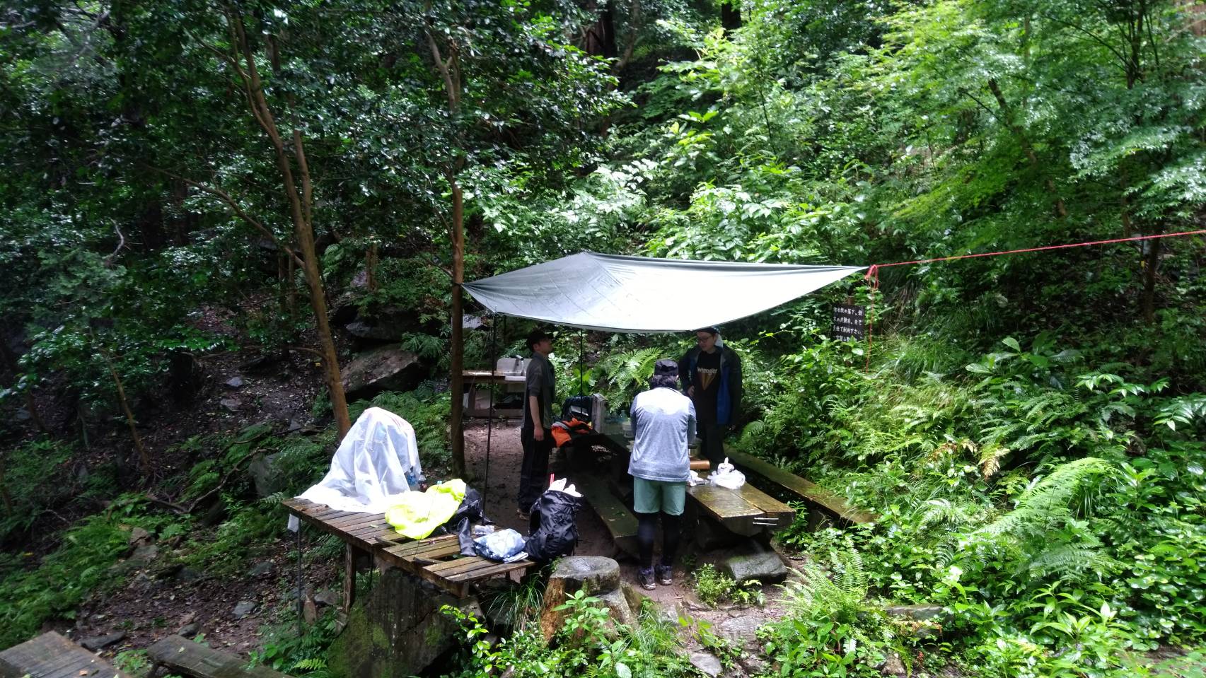 頂上まで行けませんでしたが、途中の場所にタープを張って、お昼の準備!